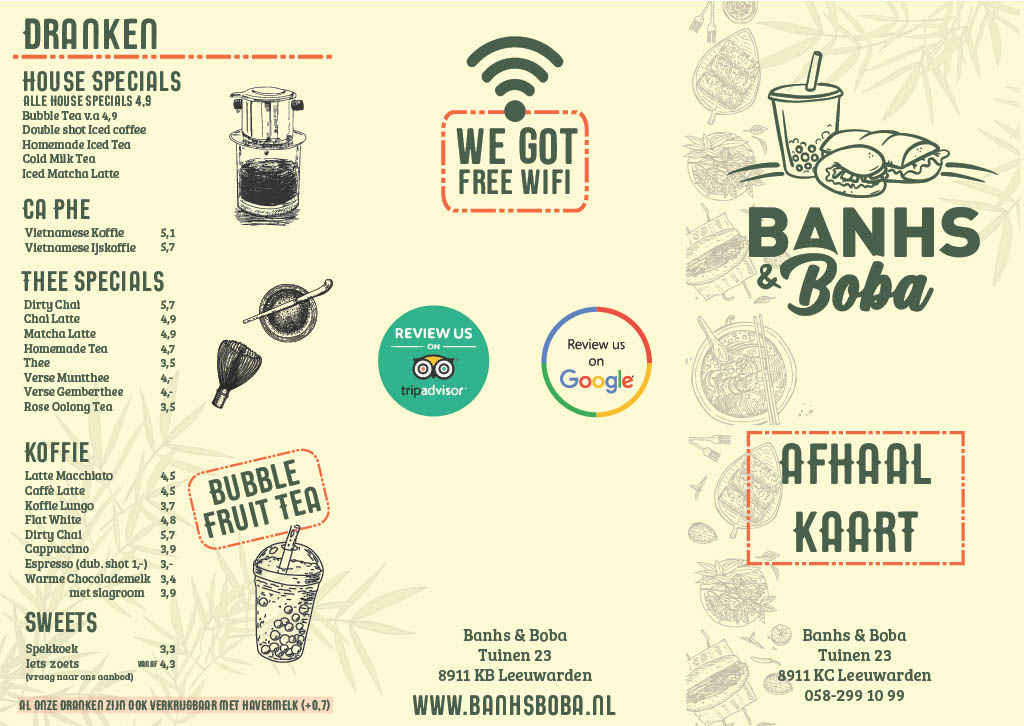 Banhs & Boba staat voor jou klaar om een verse, smakelijke maaltijd en/of drankjes te verzorgen op jouw werk, (sport)vereniging of partij!