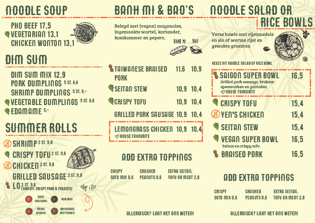 Voor de kleinste gasten (vanaf 6 maanden) staat er huisgemaakte babyvoeding Baby Udon op de kaart. Kinderen vanaf 2 jaar hebben ook een ruim aanbod van noedelsoepen en banh mi broodjes.